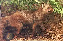 Red foxes colonised the North American continent in two waves: before and during the Illinoian glaciation, and during the Wisconsinan glaciation.[23] Gene mapping demonstrates that red foxes in North America have been isolated from their Old World counterparts for over 400,000 years, thus raising the possibility that speciation has occurred, and that the previous binomial name of Vulpes fulva may be valid.[24] In the far north, red fox fossils have been found in Sangamonian Stage deposits near the Fairbanks District, Alaska, and Medicine Hat, Alberta. Fossils dating from the Wisconsinan are present in 25 sites across Arkansas, California, Colorado, Idaho, Missouri, New Mexico, Ohio,[25] Tennessee, Texas, Virginia, and Wyoming. Although they ranged far south during the Wisconsinan, the onset of warm conditions shrank their range toward the north, and they have only recently reclaimed their former North American ranges because of human-induced environmental changes.[26] Genetic testing indicates that two distinct red fox refugia exist in North America, which have been separated since the Wisconsinan. The northern (or boreal) refugium occurs in Alaska and western Canada, and consists of the larger subspecies V. v. alascensis, V. v. abietorum, V. v. regalis, and V. v. rubricosa. The southern (or montane) refugium occurs in the subalpine parklands and alpine meadows of the west, from the Rocky Mountains to the Cascades and the Sierra Nevada ranges, consisting of the smaller subspecies V. v. cascadensis, V. v. macroura, V. v. necator, and V. v. patwin. The latter clade has been separated from all other red fox populations since at least the last glacial maximum, and may possess unique ecological or physiological adaptations.[23]