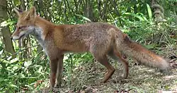 The red fox (Vulpes vulpes) is the largest of the true foxes and one of the most widely distributed members of the order Carnivora, being present across the entire Northern Hemisphere including most of North America, Europe and Asia, plus parts of North Africa. It is listed as least concern on the IUCN Red List.[1] Its range has increased alongside human expansion, having been introduced to Australia, where it is considered harmful to native small and medium-sized rodents and marsupials. Due to its impact on native species, it is included on the list of the "world's 100 worst invasive species".[4]
