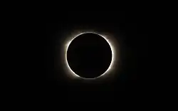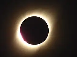 - Second contact—starting with Baily's Beads (caused by light shining through valleys on the Moon's surface) and the diamond ring effect. Almost the entire disk is covered.