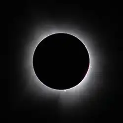 ![]() A total solar eclipse occurs when the Moon completely covers the Sun's disk. Solar prominences can be seen along the limb (in red) as well as extensively the coronal and partly the radiating coronal streamers. (August 11, 1999) | |