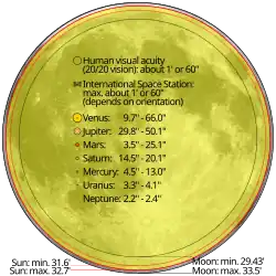 The Sun's distance from Earth is about 400 times the Moon's distance, and the Sun's diameter is about 400 times the Moon's diameter. Because these ratios are approximately the same, the Sun and the Moon as seen from Earth appear to be approximately the same size: about 0.5 degree of arc in angular measure.[6]
