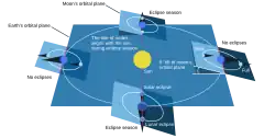 The Moon crosses from south to north of the ecliptic at its ascending node, and vice versa at its descending node.[21] However, the nodes of the Moon's orbit are gradually moving in a retrograde motion, due to the action of the Sun's gravity on the Moon's motion, and they make a complete circuit every 18.6 years. This regression means that the time between each passage of the Moon through the ascending node is slightly shorter than the sidereal month. This period is called the nodical or draconic month.[25]