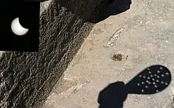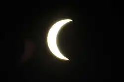 The safest way to view the Sun's disk is by indirect projection.[55] This can be done by projecting an image of the disk onto a white piece of paper or card using a pair of binoculars (with one of the lenses covered), a telescope, or another piece of cardboard with a small hole in it (about 1 mm diameter), often called a pinhole camera. The projected image of the Sun can then be safely viewed; this technique can be used to observe sunspots, as well as eclipses. Care must be taken, however, to ensure that no one looks through the projector (telescope, pinhole, etc.) directly.[56] A kitchen colander with small holes can also be used to project multiple images of the partially eclipsed Sun onto the ground or a viewing screen. Viewing the Sun's disk on a video display screen (provided by a video camera or digital camera) is safe, although the camera itself may be damaged by direct exposure to the Sun. The optical viewfinders provided with some video and digital cameras are not safe. Securely mounting #14 welder's glass in front of the lens and viewfinder protects the equipment and makes viewing possible.[54] Professional workmanship is essential because of the dire consequences any gaps or detaching mountings will have. In the partial eclipse path, one will not be able to see the corona or nearly complete darkening of the sky. However, depending on how much of the Sun's disk is obscured, some darkening may be noticeable. If three-quarters or more of the Sun is obscured, then an effect can be observed by which the daylight appears to be dim, as if the sky were overcast, yet objects still cast sharp shadows.[57]