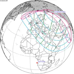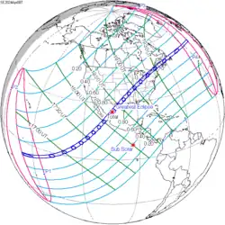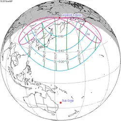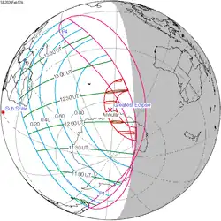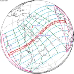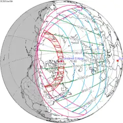 Central eclipse is often used as a generic term for a total, annular, or hybrid eclipse.[17] This is, however, not completely correct: the definition of a central eclipse is an eclipse during which the central line of the umbra touches Earth's surface. It is possible, though extremely rare, that part of the umbra intersects with Earth (thus creating an annular or total eclipse), but not its central line. This is then called a non-central total or annular eclipse.[17] Gamma is a measure of how centrally the shadow strikes. The last (umbral yet) non-central solar eclipse was on April 29, 2014. This was an annular eclipse. The next non-central total solar eclipse will be on April 9, 2043.[18]