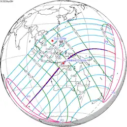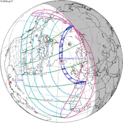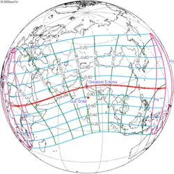 - The vector of the eclipse path at the midpoint of the eclipse aligning with the vector of Earth's rotation (i.e. not diagonal but due east).