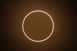 ![]() An annular solar eclipse occurs when the Moon is too far away to completely cover the Sun's disk (October 14, 2023). | |