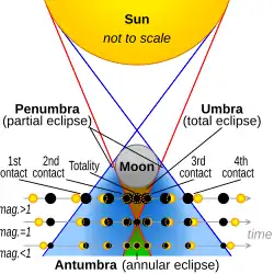 The diagrams to the right show the alignment of the Sun, Moon, and Earth during a solar eclipse. The dark gray region between the Moon and Earth is the umbra, where the Sun is completely obscured by the Moon. The small area where the umbra touches Earth's surface is where a total eclipse can be seen. The larger light gray area is the penumbra, in which a partial eclipse can be seen. An observer in the antumbra, the area of shadow beyond the umbra, will see an annular eclipse.[20]