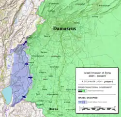 The coup led to the schism within the original pan-Arab Ba'ath Party: one Iraqi-led ba'ath movement (ruled Iraq from 1968 to 2003) and one Syrian-led ba'ath movement was established. In the first half of 1967, a low-key state of war existed between Syria and Israel. Conflict over Israeli cultivation of land in the Demilitarized Zone led to 7 April pre-war aerial clashes between Israel and Syria.[98] When the Six-Day War broke out between Egypt and Israel, Syria joined the war and attacked Israel as well. In the final days of the war, Israel turned its attention to Syria, capturing two-thirds of the Golan Heights in under 48 hours.[99] The defeat caused a split between Jadid and Assad over what steps to take next.[100] Disagreement developed between Jadid, who controlled the party apparatus, and Assad, who controlled the military. The 1970 retreat of Syrian forces sent to aid the Palestine Liberation Organization led by Yasser Arafat during the "Black September (also known as the Jordan Civil War of 1970)" hostilities with Jordan reflected this disagreement.[101]