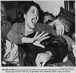 On 7 February 1964, the Beatles departed from Heathrow with an estimated 4,000 fans waving and screaming as the aircraft took off.[100] Upon landing at New York's John F. Kennedy Airport, an uproarious crowd estimated at 3,000 greeted them.[101] They gave their first live US television performance two days later on The Ed Sullivan Show, watched by approximately 73 million viewers in over 23 million households,[102] or 34 per cent of the American population. Biographer Jonathan Gould writes that, according to the Nielsen rating service, it was "the largest audience that had ever been recorded for an American television program".[103] The next morning, the Beatles awoke to a largely negative critical consensus in the US,[104] but a day later at their first US concert, Beatlemania erupted at the Washington Coliseum.[105] Back in New York the following day, the Beatles met with another strong reception during two shows at Carnegie Hall.[102] The band flew to Florida, where they appeared on The Ed Sullivan Show a second time, again before 70 million viewers, before returning to the UK on 22 February.[106]