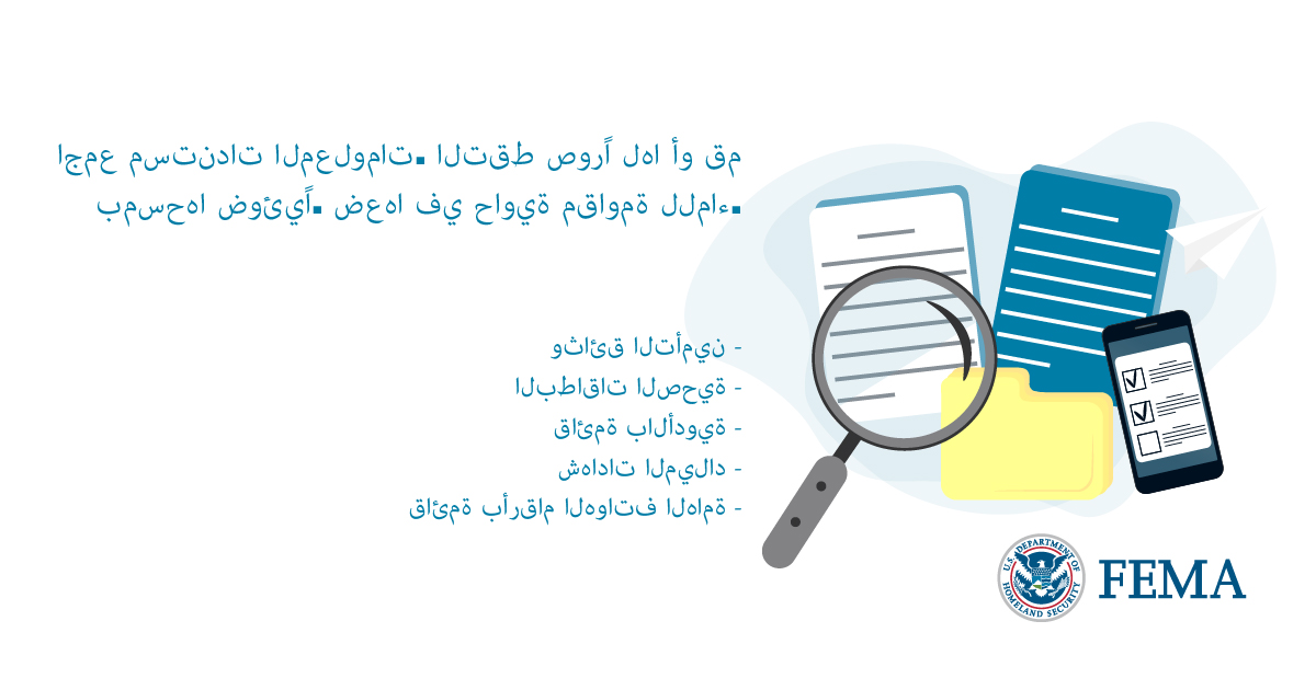 اجمع المستندات المهمة. التقط صورًا لها أو امسحها ضوئيًا. ضعها في حاوية مقاومة للماء. اجمع مستندات التأمين وبطاقات الرعاية الصحية وقائمة الأدوية وشهادات الميلاد وقائمة بأرقام الهواتف المهمة.