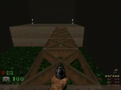 In your level editor of choice, make two platforms and an obstacle in between; in this example a nukage pool is used. The sectors have a ceiling height of 256, the platforms have a floor of 0 and the nukage pool has a floor of -128. You will obviously need a player start so you can play the map.