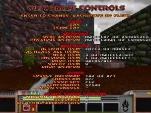 While in the menu, the "Enter" key selects a command for adding a bound key, the "Escape" key cancels the change, and the "Backspace" key unbinds all keys bound to this command. Controls that are bound to an action with a + prefix (e.g. "+attack") are continuous: they start being executed when the corresponding key is pressed, and will continue until the key is released, issuing the reverse command ("-attack" in this example). Any console command can be bound to a key; custom sections with additional commands can be added to the standard customize controls menu with a KEYCONF lump.