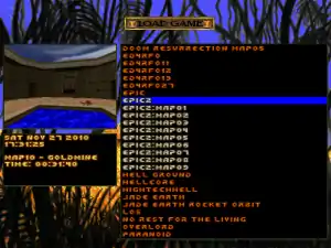 The load game menu allows access to the list of saved games made from the played IWAD. Saves created with the same selection of mods are displayed in white; saves created with mods not currently loaded are displayed in orange and cannot be loaded. Its MENUDEF name is LoadGameMenu and it can be summoned with the menu_load console command.