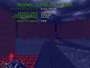 The module replayer options menu allows to change settings related to playback of tracker modules. Its MENUDEF name is ModReplayerOptions and it can be summoned with the menu_modreplayer console command.